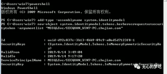 Add-Type -AssemblyName System.IdentityModel New-Object System.IdentityModel.Tokens.KerberosRequestorSecurityToken -ArgumentList " MSSQLSvc/SECQUAN_WIN7-PC.zhujian.com "