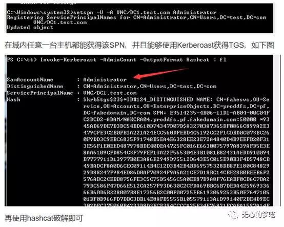 如果我们有了SPN的注册权限,我们就可以给指定的域用户注册一个SPN,然后获取到TGS,然后破解得到密码